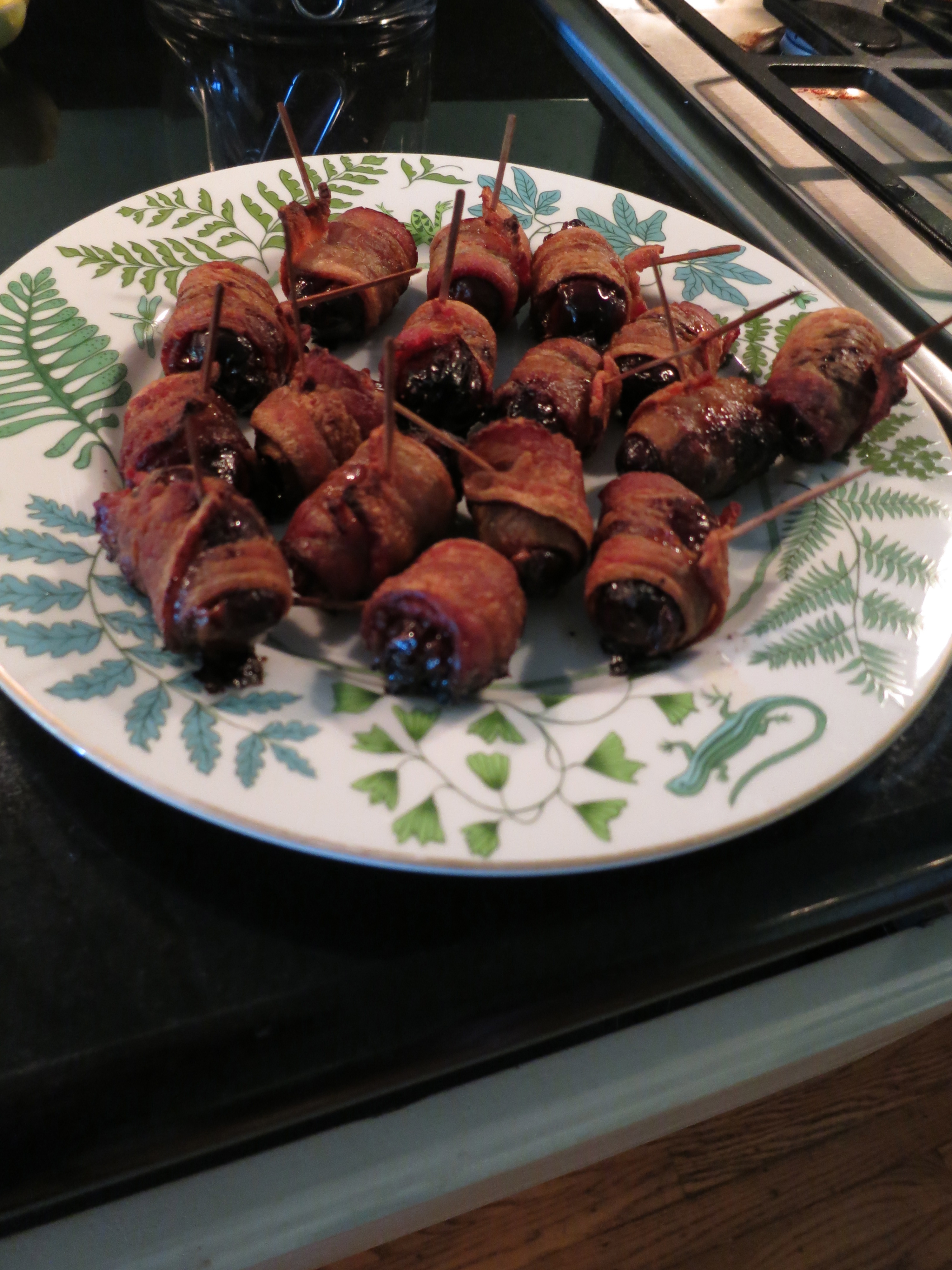 Cut the bacon strips in half. Pit the dates (or if you are short on time buy pitted dates). Tightly roll the bacon around the dates and secure with a toothpick. Place the dates in a baking dish about 1/4 inch apart.